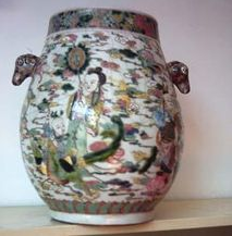 粉彩《八仙过海》鹿耳牛头尊高34。3厘米,口径13。8厘米,足径17。5厘米。底红料彩厚框“慎德堂制”篆款,款式工稳。 此尊型为典型的牛头尊,圆唇口,颈略收,球形腹,矮圆足,颈部两侧分别堆塑鹿头。(买来时鹿头角全涂黑,以为有损,用刀片细细刮去,才发现完美无损。)整体古拙、庄重、流畅、工稳、大气,是民