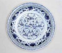 此器造型美观大方而规整,为元代典型盘式。其绘画精致,纹饰构图严谨,以多层带状辅纹衬托主题花纹,各层花纹间以青花双圈线相隔,装饰饱满但主次分明。青花色泽艳丽,系用进口的苏泥勃青料。此盘为元代晚期景德镇窑青花瓷器之精粹。