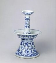 烛台分上下两层,上层托盘小而浅,下承以细长的支柱,下层托盘为撇口,折底,盘下承以喇叭形外撇高足。通体青花装饰。小托盘外壁绘如意云头纹,大托盘外壁绘勾莲花枝纹,间以菱形纹饰。支柱及高足外壁的中部均有圆形开光,内书阿拉伯文,开光上下绘勾莲花枝纹及菱形纹。近足底处绘如意云头纹。外底署青花楷书 “大明正德年制” 双行六字款,外围青花双线圈。