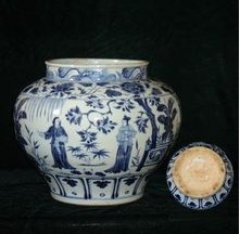 锦香亭罐的罐口有修补,所以其价值便大大低于了同时期拍出的“鬼谷子下山图罐”。锦香亭罐是元青花八大罐之一(绘有人物故事的元青花罐所知传世者仅有8件,故称元青花八大罐),这八罐分别是: