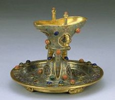 此爵杯胎壁厚重,花纹以双线技法精细地勾勒,线条粗细均匀,杯盘上镶嵌珊瑚、青金石、绿松石等宝石,应是清乾隆朝在祭祀场合使用的礼器。