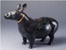 这件宝物属战国中期,牺尊高28.5厘米,重5.21公斤,背部有盖,可以打开合上;口部有流孔,可以把酒倒出来。牺尊的粗脖子上镶了一圈金环带,眉眼嵌有松绿石和孔雀石,通体装饰有斜角云纹,还有金银镶嵌。牺尊的体形圆浑、细致而生动,有如一尊神兽。据记载,战国时期用松绿石等镶嵌在青铜器表面作装饰的手法较常见,为的是使青铜器看上去更华丽,据说这种镶嵌的文物今天也有留存,但像牺尊这样造型精美的动物形酒尊,传世极为少见。