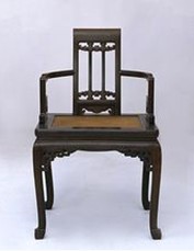 此椅栅栏式背板,背板过肩处凸起形成搭脑。板框中雕上下两组云纹,下接座面处有云纹亮脚。靠背两肩向前兜转,至扶手处下转,卷成回纹。席心座面。鱼肚形牙板,两角有镂空拐子纹托角牙。四腿内收,外翻马蹄。此椅整体虽为明式风格,但细部装饰已显露清式风格之端倪。