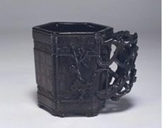 明清时期的木雕题材丰富,分为硬木雕刻和软木雕刻两种。硬木雕刻多采用紫檀木、黄花梨、红木,软木雕刻多采用黄杨木、楠木、檀香木、沉香木等,并产生了东阳木雕、福建龙眼木雕和广东金漆木雕等几个流派。此杯色调深沉,造型气派,嵌银丝的手法以及雕饰的纹样尽显富贵之象。