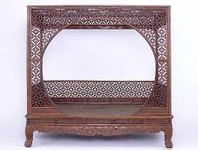【名称】明黄花梨月洞门架子床 【类别】故宫明清家具 【年代】明代 【文物原属】清宫旧藏 【文物现状】现藏北京故宫博物院 【简介】 高:227cm,横:247.5cm,纵:187.5cm。 床由床屉、床围、立柱、月洞门、倒挂牙子及床顶等多件组成。各结合部位均用活榫,便于分解组合。床身正面装椭圆形门罩,民间常称此为月亮门。床围以三部分组成,均为雕如意云头纹加十字形构件攒成透棂。床面为棕屉,上附花眼藤席。床面下高束腰,周围用竹节形矮佬界出16格,格内镶板,并浮雕花鸟蔬果,图案无一相同。束腰下承托腮。四面牙板与腿足作成壶门形。牙子边缘起线,对称浮雕螭纹及卷草纹。四腿三弯式,云纹足。此床之雕饰十分精致。 上一篇:明黄花梨小长桌
