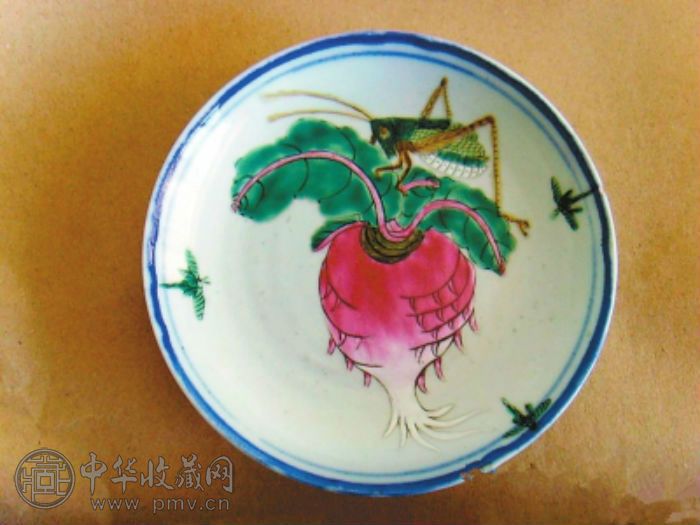 清粉彩碟“秋虫逗萝卜”,描绘秋虫与萝卜的相伴相生。只见一只紫红萝卜,肥肥壮壮,萝卜上有一只青虫,体内的细丝和萝卜的叶子缠绕在一起,青虫上又有一只蟋蟀,触须伸张,大腹便便,准备鼓腹而歌。在盘子的四周,还有三只小飞蛾,正在振翅飞翔,好像被这美味的萝卜诱惑,准备停落在萝卜上一吮甘甜。该粉彩碟直径13.5厘米,高3.5厘米,除一处缺口外,其余品相完整,底部有“大清光绪年制”。