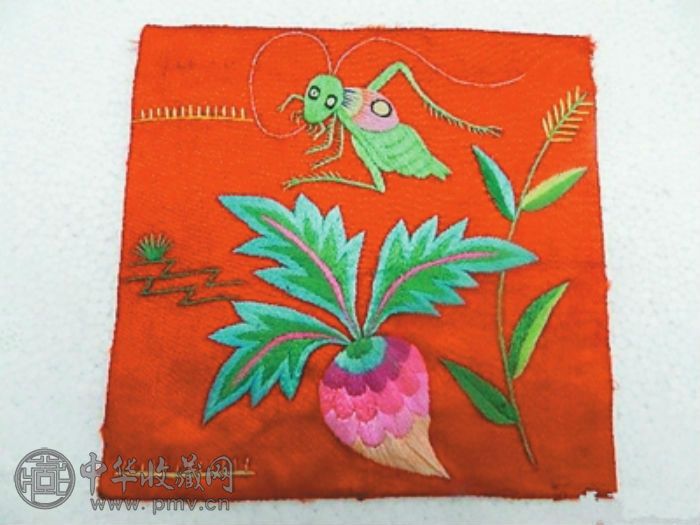 “田园风光萝卜鲜”是一块民国年间的正方形绣片,长10.3厘米,宽10厘米,上面的图案呈一派田园风光:错落有致的篱笆外,弯弯曲曲的小径通往萝卜田,紫红的萝卜分着层次,大片的叶子,青翠欲滴。萝卜旁边,是颗粒饱满的稻穗;萝卜上方,是一只可爱的蟋蟀,弯着触须扭过头,垂涎欲滴地看着萝卜,好像想上去咬一口。该绣片的绣工很精细,能照顾到像蟋蟀腿上的根根小刺,十分难得。