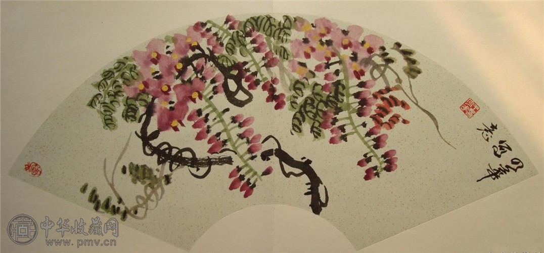 历史到了近现代,因受外来文化的冲击,中国画坛的格局发生巨大变化,逐步走向多元与多样,流派纷呈、斗艳争奇。花鸟画扇面领域,出现了以任伯年、虚谷等为代表的上海画派,以齐白石等为代表的北京画派,和以“二高一陈”为代表的岭南画派等。任伯年的花鸟画扇面,自辟蹊径,个性鲜明独特,创开新的意境,他将工笔、写意和没骨等技法,在扇面画创作中交替运用。而在艺术夸张和笔墨处理上,虚谷也独有心得。京派代表齐白石则从学习民间艺术开始,他的花鸟画扇面,在继承传统功力基础上,摸索出“万虫写照,百鸟传神”的笔墨技巧,成功实践了他所坚持的“妙在似与不似之间”的信条。“二高一陈”,却立足中土,吸取西洋技法,并从日本画借鉴。总之,各派的画家们,在传统花鸟画扇面的构图、造型、结构和赋采等方面,都有颇大的创举,其影响延续至当代,余音依旧绕梁!