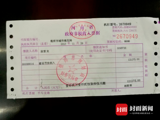段继灵与郭明奇向封面新闻记者提供了24张罚款票据,手写与机打均有。时间跨度从2009年一直持续到2014年,金额共计946018.5元,其中最大一笔为2013年11月29日所罚的121275元,最小一笔则是2014年9月4日所罚的326元。