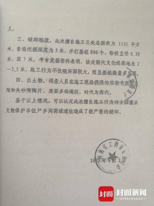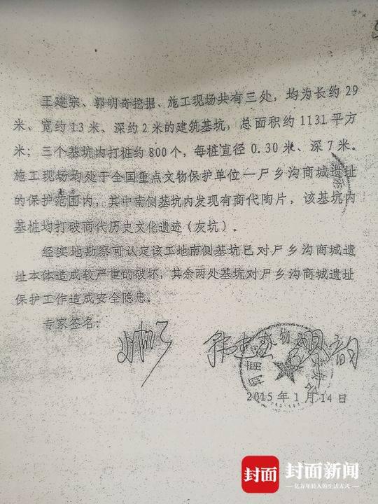 补充说明显示,此次擅自施工位于尸乡沟商城四号建筑遗址,“该遗址位于尸乡沟商城北部通北城门之大路西侧,距北城墙180米,呈长方形。南北长25米、东西宽20米,遗址夯土距地表深3.7米、厚度1.2米。”而此次并无鉴定人员签字。
