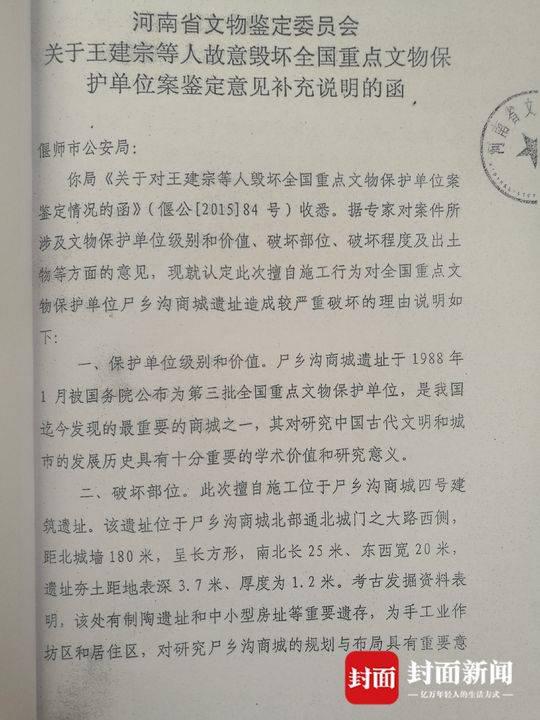 据此,“河南省文物鉴定委员会”于当天出具“豫文物鉴字[2015]第2号”鉴定意见书,称“南侧基坑已对尸乡沟商城遗址本体造成较严重的破坏”,其余两处基坑也对遗址造成安全隐患。鉴定人为史家珍、韩建春、缪韵,鉴定文书中,分别有三人签名,以及河南省文物鉴定委员会的公章。