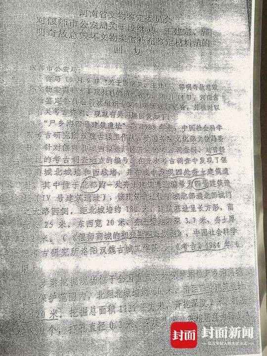 依据回复描述,涉案挖掘现场位于遗址保护范围,“北距北城墙60米,南距四号建筑遗址约120米。”而作出此次鉴定的鉴定人员,又是史家珍、韩建春、缪韵。