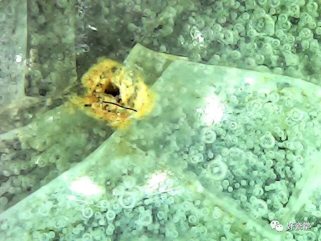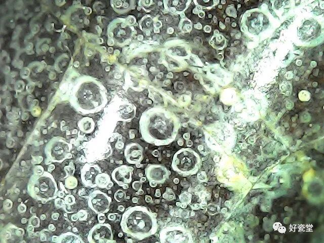 图1-3口沿气泡清晰,较稀疏,有重叠,大小不均,透过釉面可见灰色胎体