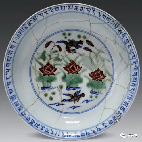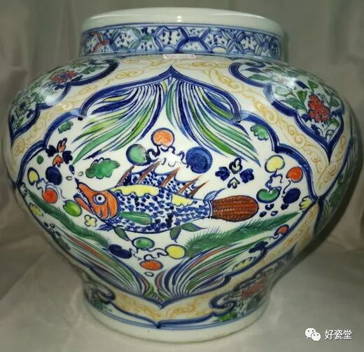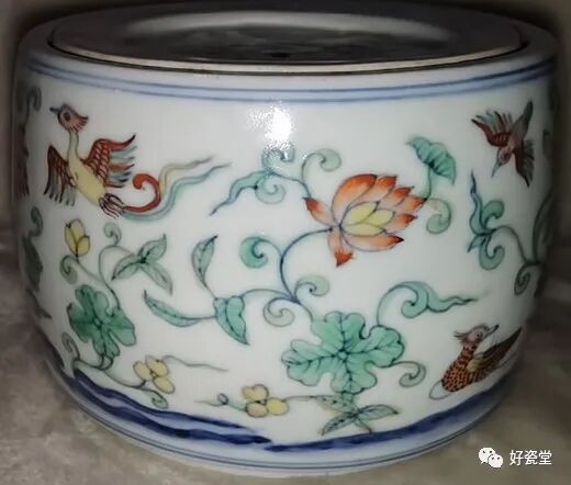 此罐虽然具有元代特征,因没有到手的力证,不能轻易确定为元代的斗彩陶瓷!拥有者无底气、将信将疑,一些同好们有的受1988年11月景德镇明御用窑厂遗址出土的大明宣德年制“斗彩”鸳鸯莲荷纹盘的宣传影响,直接怀疑是后朝仿前朝之器;有的认为不可能;有的干脆说是新仿之物!