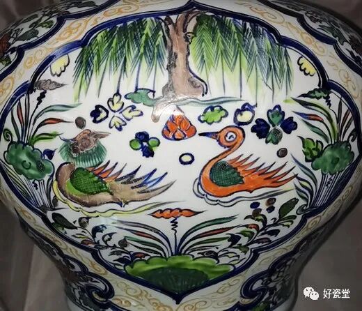 图8-3如意披肩四开光莲塘鸳鸯鱼藻纹斗彩罐局部鸳鸯纹