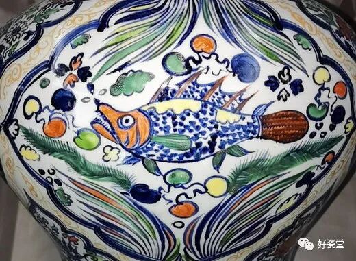 图8-2如意披肩四开光莲塘鸳鸯鱼藻纹斗彩罐局部鱼藻纹