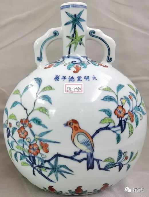图5-1“大明宣德年制”六字楷书款的花鸟纹斗彩抱月瓶,经量子检测是1430年烧制的