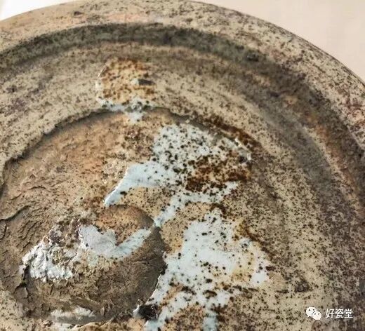 此罐胎质稍粗、有一大螺旋修胎、底胎可见一些淡淡的胎红(或称火烧红)及黑芝麻斑点,偏中间约有几厘米见方的薄釉斑、氧化较好。