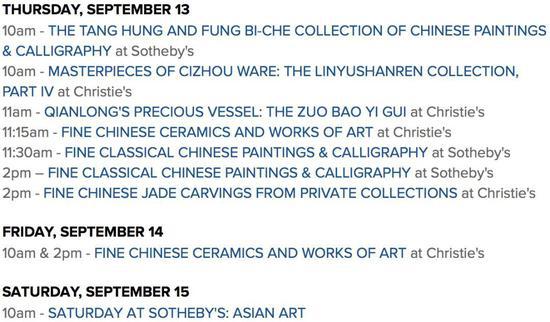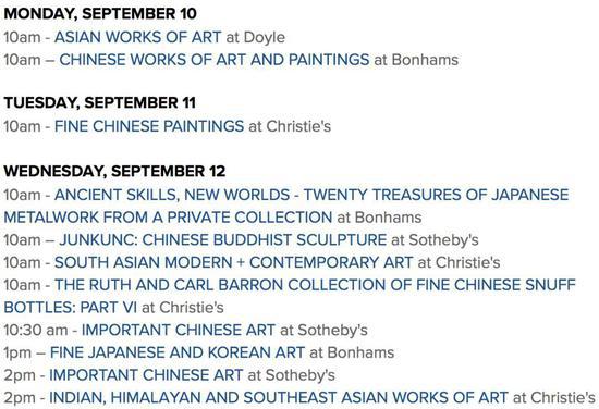 ▲2018年秋季纽约亚洲艺术周拍卖场次时间表,图片来源:Asia Week New York Association