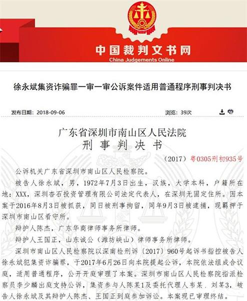 深圳市南山区人民法院近日判决,徐永斌犯非法吸收公众存款罪,判处有期徒刑5年,并处罚金10万。