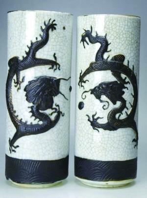 “龙抬头” 堆塑画筒。堆塑是我国的一项传统技法,也叫“堆贴”和“堆雕”,是一种在器物上堆垒图案或者贴制图案的方法。图{3}是一对清代晚期的哥釉堆塑龙纹画筒, 它高26.6厘米,直径11.3厘米,是文房之中,盛放画轴或者卷轴用的。这对画筒上面,便有堆塑的龙形图案,只见背景是呈裂纹状或者鱼鳞状的白釉,正是 哥釉的明显特征。上面的龙呈黑色,龙尾在上,龙头在下,仿佛两条巨龙从天而降,要将甘霖雨露洒向人间。在龙的边上有一颗珍珠,为“龙戏珠”图案,是我国代表祥瑞的图案和形象之一。