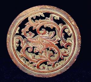 “龙抬头”榉木雕件。木雕也是我国极具东方特色的艺术形式之一,即在木头上雕刻出花鸟虫鱼,山水人物等各种图案。图{4}是一件清代晚期的木雕件,为山榉木所制,呈圆形,直径为10.2厘米,雕刻的图案正是“龙抬头”。只见百花盛开,争奇斗艳,看起来,春回大地,万象更新。在花丛中,便有一条蜿蜒盘旋的巨龙,正昂起头,向人间探望,万紫千红总是春,龙腾万里气象新。雕件采用镂空雕的形式,如果镶嵌在暗格或者屏风之上,自然会增色不少。