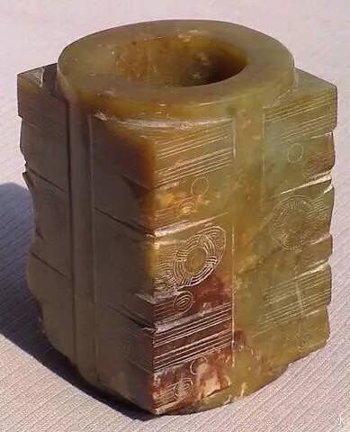 玉琮:玉琮是外方内圆中空的柱状玉器 圆柱在两头突出,称为射上大下小,有长有短有纹饰。 玉琮的历史从新石器时代晚期到初。有3000年历史。用作礼器: 祭地。棕的形状是方柱体,当中却是上下相通的圆筒子。琮的外面有光素的,也有纹饰的,纹饰的结构大都相同。古时候的祭祀玉器是用几块玉,用绳子穿联起来,块数并不一定。后来有人觉得先把玉雕琢成几块,再用绳子穿联起来,何不雕琢成一块玉,用纹饰表示出它是由几块玉串成的,岂不省事。这种形状的器物,大的便是「琮」,小的就是「勒」。故宫收藏的琮,数一数看,那是十七块玉的形象;另一个是六块玉的形象,还有一个比前面两个都小,这就是一个「勒」。根据现代人考証,琮是代表女性、阴性,和圭正好相反。琮既然代表女祖,而为人民礼拜的对象,琮的使用就广了,这也是存世的棕比较多的原因。