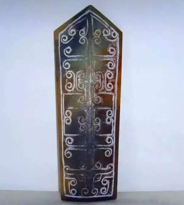 玉圭:由戈或石斧演化而来,尖首圭由戈演化而来。戈在商代已有,是阶级社会的 一种礼器,不同爵位的人所执圭的形状不同,以示等级。圭用作朝拜、祭东方之神。斧既然是古人每日不可或缺的器具,使用日久,而产生感情。在器具汰换之后,石斧虽然失去实用价值,但仍怀念曾有的贡献,于是留作纪念,供奉如神明。而后统治者利用人民崇拜石器的心理,将石斧、玉斧用来做为礼器,于是产生了「圭」的形制。所以圭的形制和斧的形制是同类不同形的两个器物。它们都是上端前薄,作方头的形状。故宫博物院陈列著两件商圭,很受参观者的喜爱。其中一件,整个玉器呈赭石色,器身遍布土斑。而故宫所收藏的玉圭,凡是经过清高宗乾隆皇帝镌刻有御题诗的,都上下颠倒。像展示的两件商圭,就是以厚而狭的一端作为上端,这是为了迁就文字的排列方便,才这样摆置的。