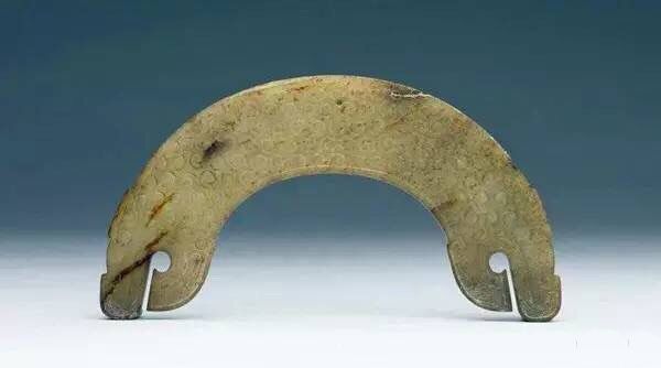 玉璜:半璧形或小于半环的弧形,两端有眼或中间靠上有眼。可为龙首、虎首,常 有纹饰。 璜是最早出现的佩饰,出土分布遍布全国。周代演变为礼器:"以玄璜礼北方"。璜的形状像上弦月,两头削平,窄窄的,小半圆形。璜是祭祀北方之神的礼器,用墨玉来雕琢。北方之神为玄武,玄武指龟神,用龟壳的外形,和璜相近,加上龟壳的颜色接近元玄的墨色,所用来祭祀北方。璜在中间靠上端穿一个小洞,有时两头各穿一个洞便于穿绳。小型的璜是佩饰之物。