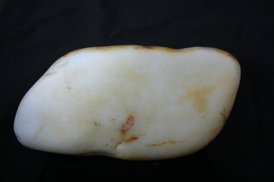 籽料表面常有僵斑,有软僵、硬僵、石性、玉性、石灰化,如果假色遇上僵斑,是一定会染上的,正如之前所说,假色的附着力非常强,但是如果是真色,僵斑多数是附着不上颜色的,即便附着上了,也会呈现出颜色变化。不过注意,当下有一种手法是先染色后烧僵,如此一来僵斑是没有颜色的。
