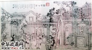 据了解,《庆赏元宵》这幅年画是清末时期的作品,该作品实际上是一幅刚完成墨线的半成品年画,尚未上色。因画稿是1903年著名的杨柳青画师高桐宣所做,极具收藏价值。当时创作此画稿时,高画师已68岁。民间传说,高桐宣曾经为慈禧画像,他的年画中融合了一些西洋派画法,笔触逼真细腻。同一时期,他还创作了不少以《红楼梦》故事为题材的人物年画,深受当时百姓的喜爱。农历正月十五是元宵节,画中描绘了元宵佳节时北方富户庆赏元宵之乐趣。图中共有十几个形态各异的人物,他们在院子里吹吹打打欢庆元宵节,妇女兴高采烈,儿童提灯玩耍。