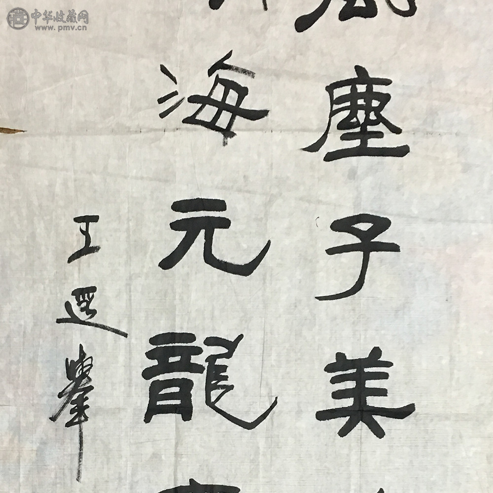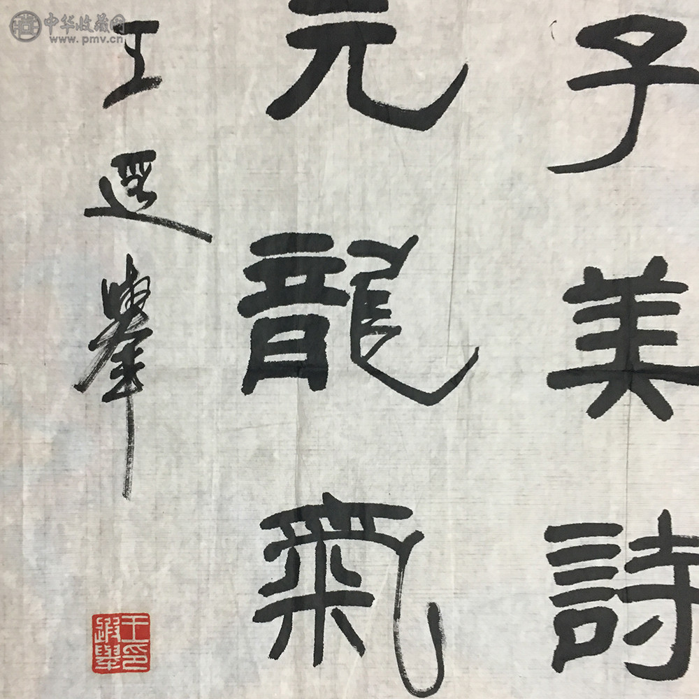 先生的隶书主要取法汉代经典碑刻,其隶书既有《张迁碑》的方整、古拙,又有《礼器碑》的瘦硬、古雅,还有《石门颂》的劲健、飘逸。但他的隶书同时亦不乏篆书的意蕴,篆书对其隶书笔法的影响很大。虽然方笔是隶书笔画最典型的特征之一,但汉隶仍以方圆兼备为主,纯用方笔的汉隶是不存在的。篆书对隶书笔法的影响还体现在用笔的转折上,在王先生的隶书中有时甚至刻意避开隶书的波磔这类笔画,而用中锋书写隶书,采用的中锋篆法给人以高古之感。他的隶书中锋为主兼以侧锋。险峻、劲利的方笔和放逸、浑厚的圆笔的同时运用是其线条的特征。从其隶书基本点画的形体看,变连接为分散,其笔法在篆书用笔婉转的基础上,明显地增加了提按、藏露、转折等,使得点画更加丰富多彩。其中折笔、波挑笔法的运用使其点画更为生动。其隶书的点画无论是浑圆厚重,还是简洁畅爽,都同样表现出了凝练遒劲的艺术特色。