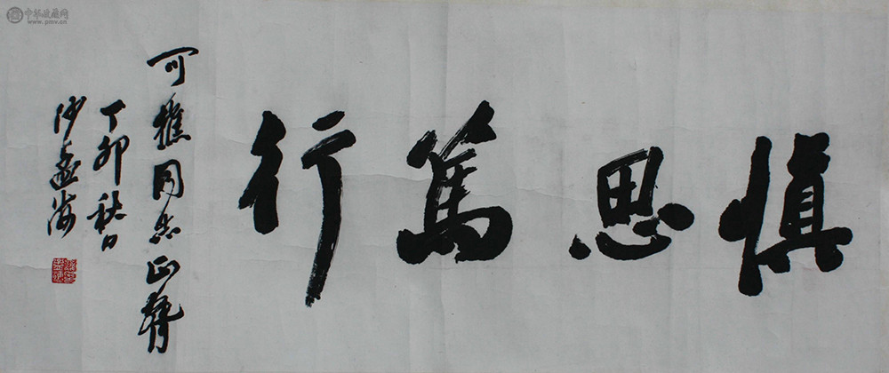 沙孟海(1900-1992年),原名文若,字孟海,号石荒、沙村、决明,鄞县沙村人。出生于名医书香之家,幼承庭训,早习篆刻,曾就读于慈溪锦堂学校,毕业于浙东第四师范学校。1922年,沙孟海到上海担任家庭教师期间,有幸接触令他十分仰慕的康有为、吴昌硕等大师,对以后沙孟海的书法和篆刻产生了深远的影响。1925年他任教商务印书馆图文函授社,其间,从冯君木,陈屺怀学古文学,使他学艺大进。章太炎主办的《华国月刊》,多次刊载他的金石文字。曾任浙江省文物管理委员会常务委员、浙江省博物馆名誉馆长、中国书法家协会副主席、浙江省书法家协会主席、西泠印社社长、西泠书画院院长、浙江考古学会名誉会长等职。其书法远宗汉魏,近取宋明,于钟繇、王羲之、欧阳询、颜真卿、苏轼、黄庭坚诸家,用力最勤,且能化古融今,形成自己;独特书风。兼擅篆、隶、行、草、楷诸书,所作榜书大字,雄浑刚健,气势磅礴。沙氏学问渊博,于语言文字、文史、考古、书法、篆刻等均深有研究。