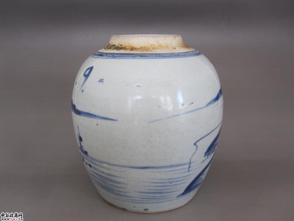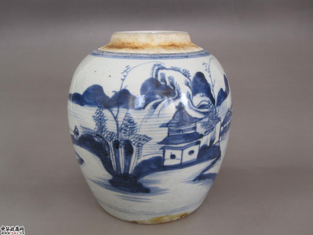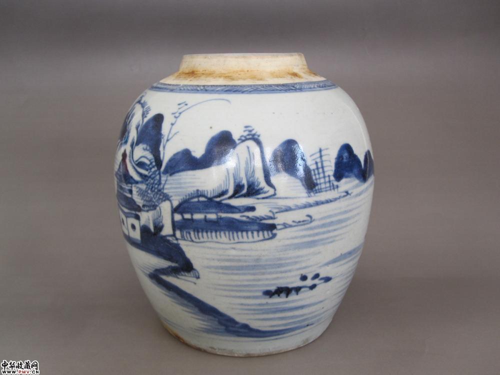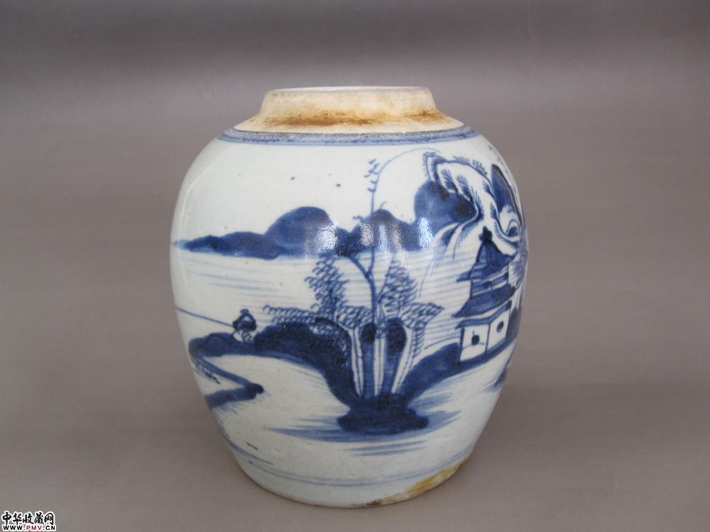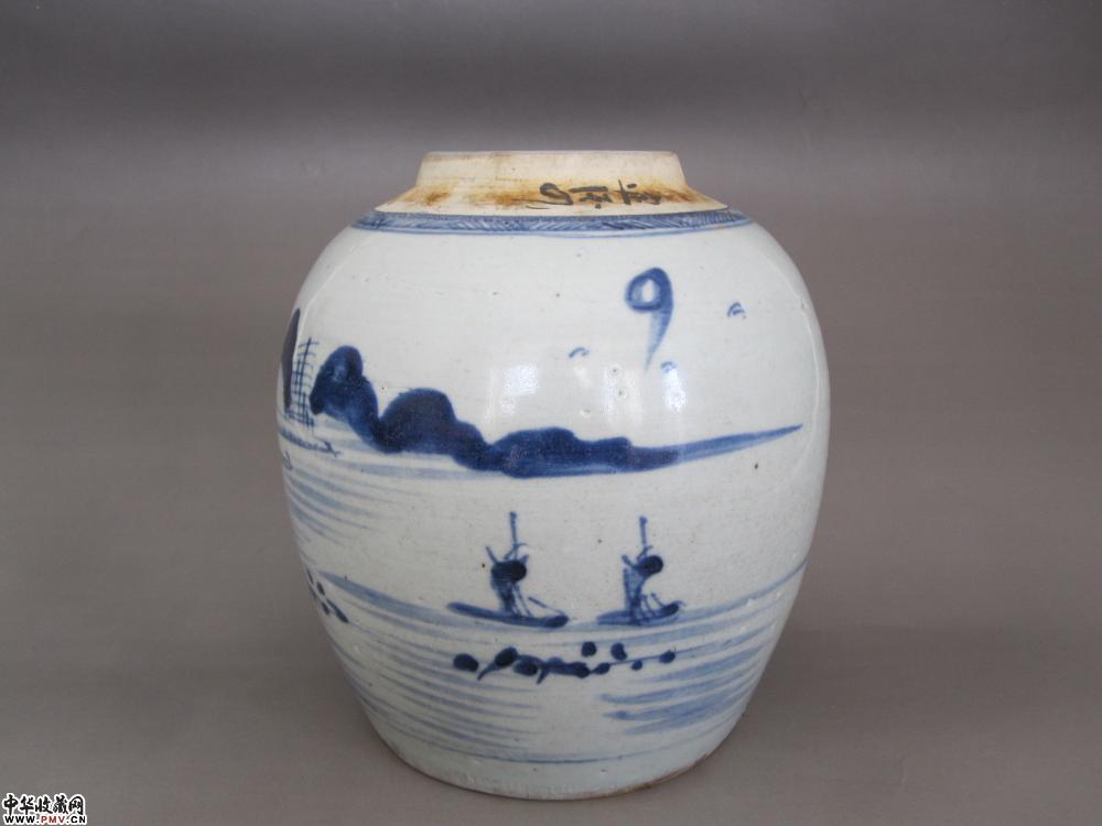 清代青花山水人物纹罐《已售》