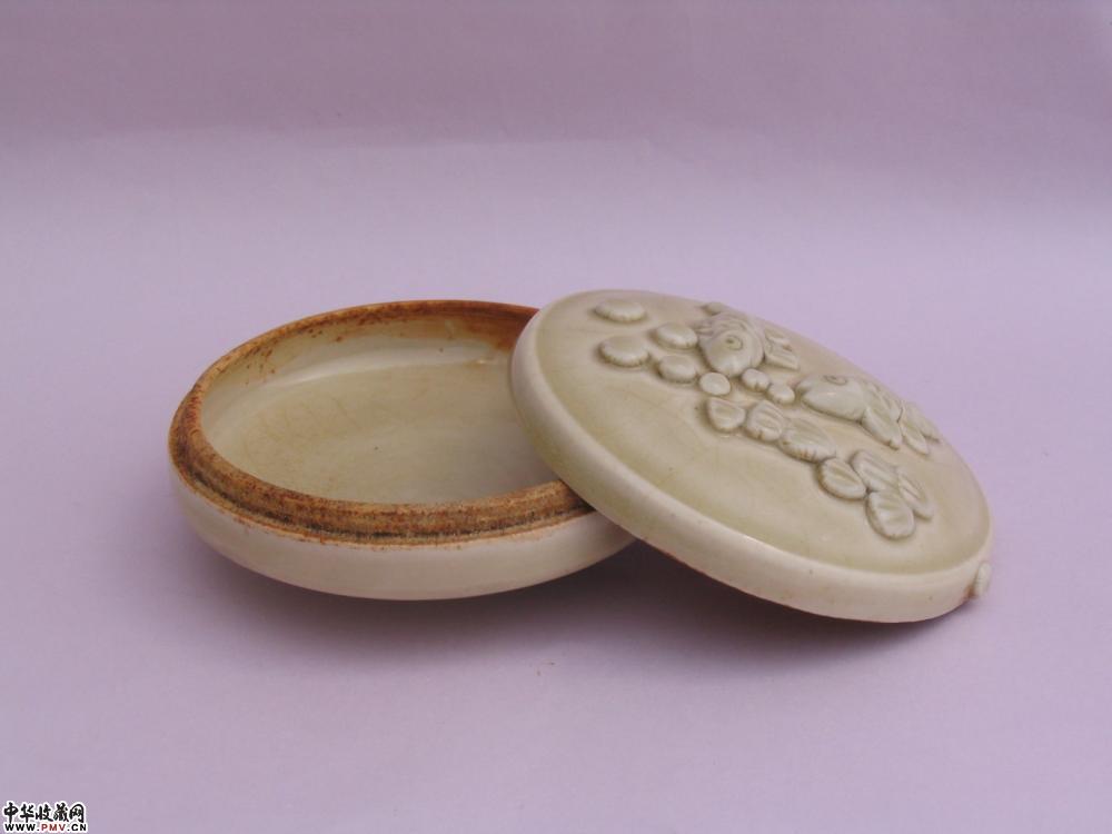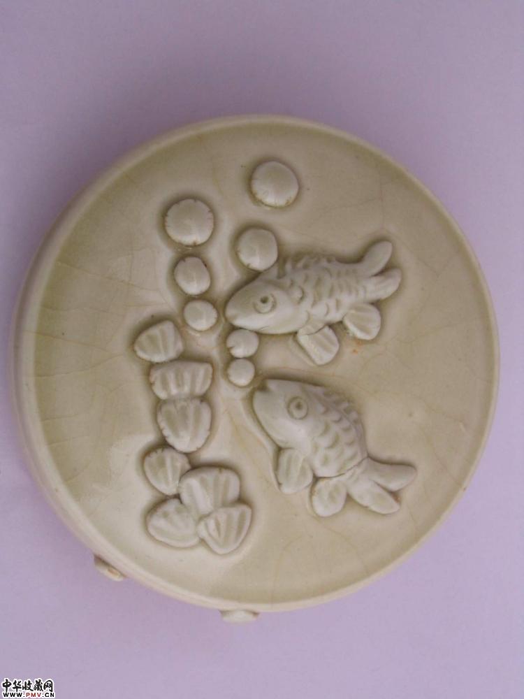北宋定窑贴塑鱼藻纹粉盒
