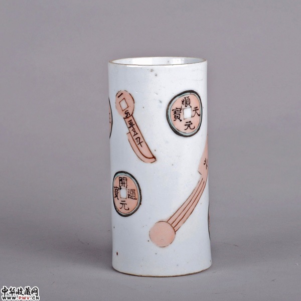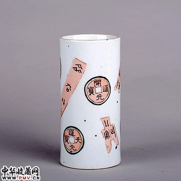 胎体坚实细腻,器形端庄规整,精致小巧。以各朝代钱币图案为纹饰,寓招财进宝之意。