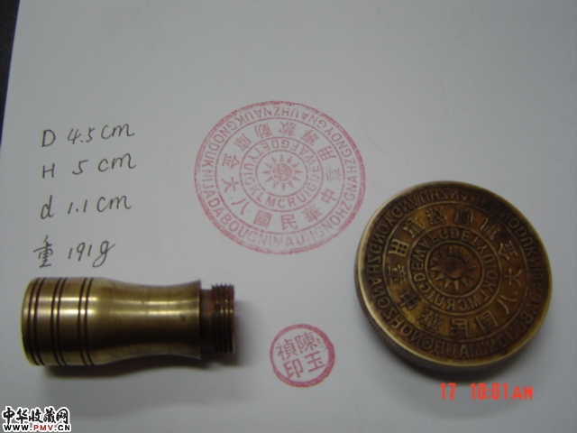 一枚铜印及其有关05年元月我在陕西安康古董商李先生家中见到一枚铜质印章。通高5.2厘米,印面圆形, 厚0.5厘米,直径4.4厘米。主体印章从中心到边用圆线分为四个区:中心是12角星图案;往外是一组字母(至今我还没弄清是什么文什么意);再往外是:“中华民国八大金库动款专用章”字样;最外圈是相应的拼音。印的圆柱型手把与主体印面用锣体旋接,拧开里面是一直径为1.5厘米、有“陈玉祯印”四字的圆型私印。尽管 “八大金库”在我心中是不可信的传说,但此印章质地与制作工艺与古玩地摊的赝品印章显然不同:1、主体印面的字体文饰是热冲压工艺;2、小印字体是手工雕刻,字正底子平,非一般工匠手艺;3、手把上的梅花纹是不成熟的酸洗工艺。