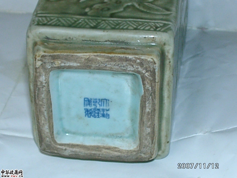 大清乾隆年制款,豆青釉刻花方瓶
