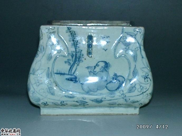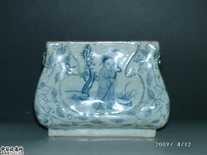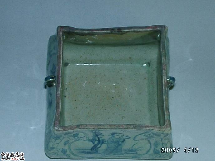 明青花四凹开光双耳四方笔洗 缠枝莲框中心人物故事 一方敌四圆