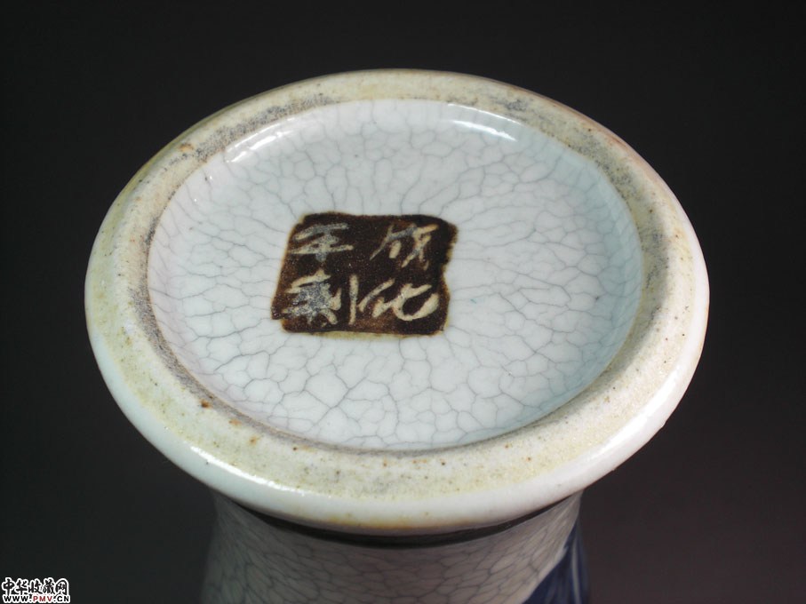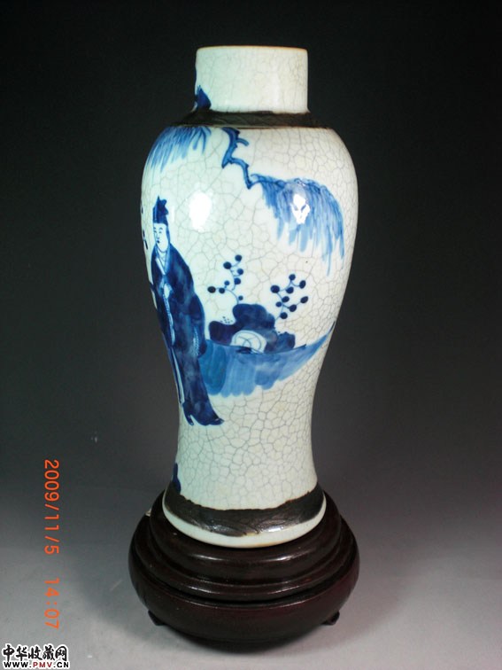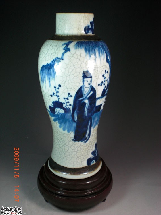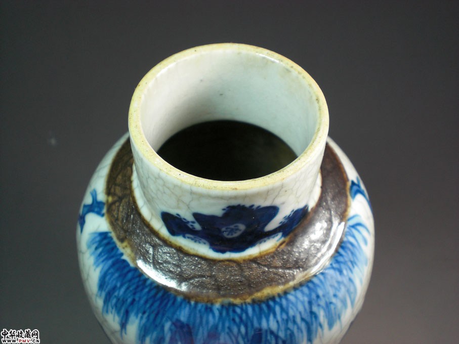 高25.8厘米,口沿一小惊釉,与开片融为一体,很难看出,其它完好。青花发色艳丽,整体造型规正,修足流畅自然,是一件很好的收藏品!