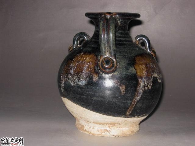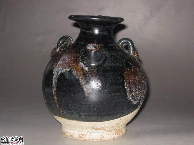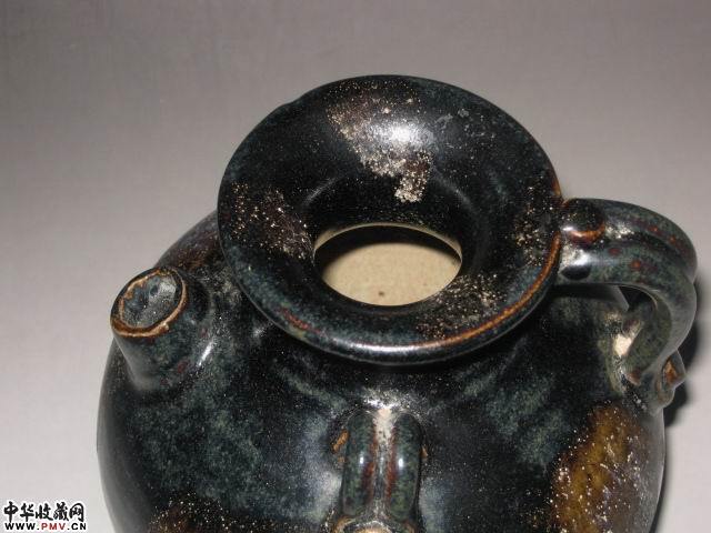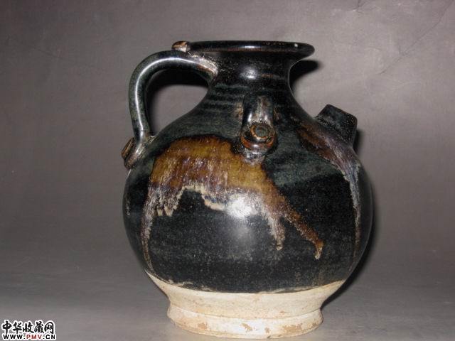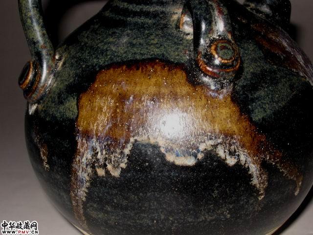 唐庐山窑变双系古丁把壶 俗称(花斑釉)或(黑搪钧)属唐代钧瓷。