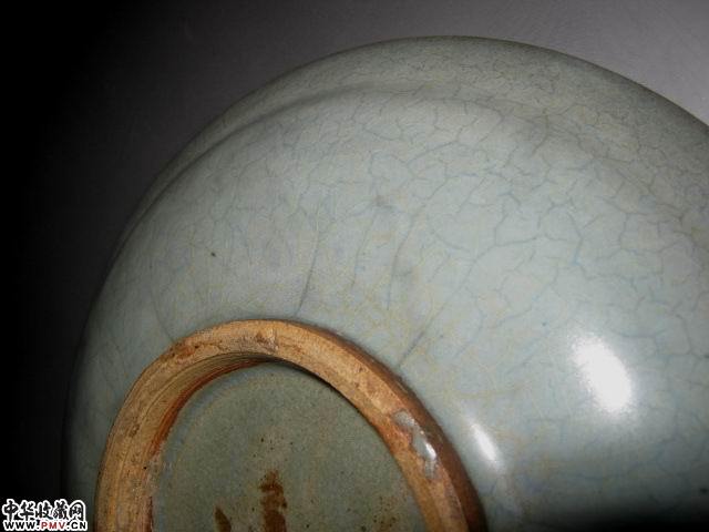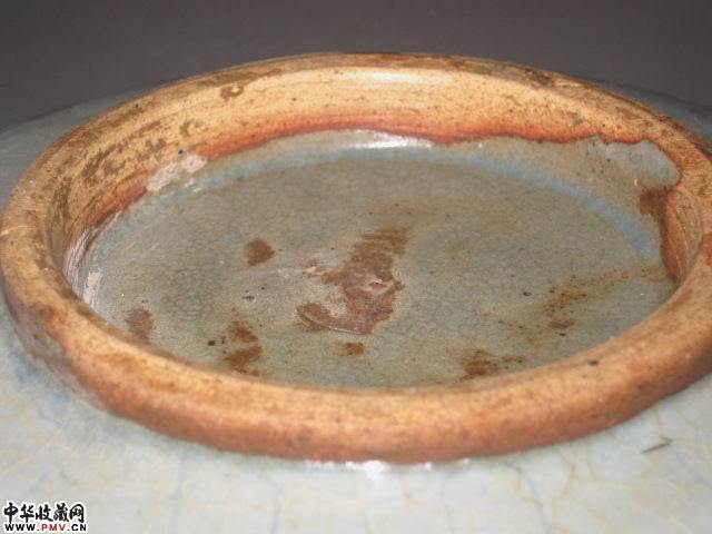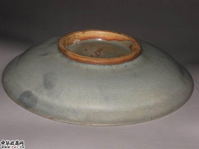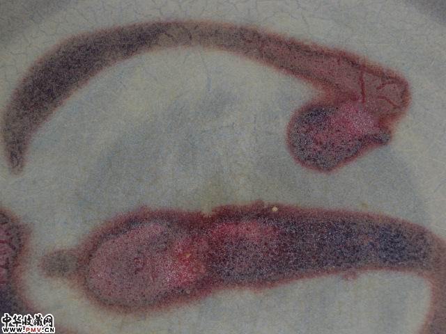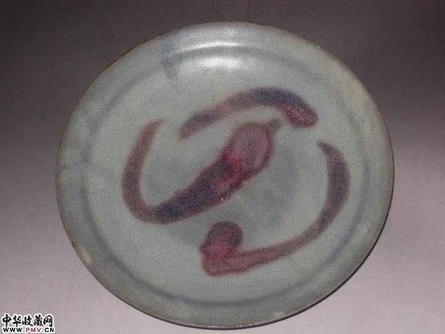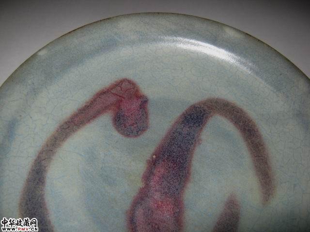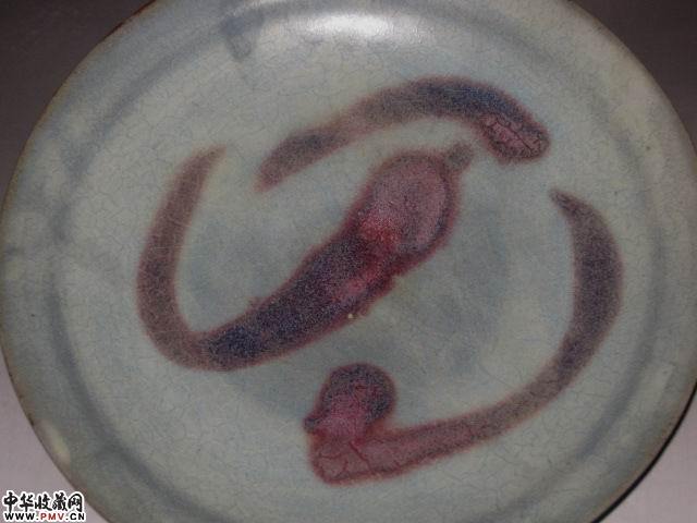 高4.5直径22厘米。完好,此盘釉水滋润肥厚近天青灰色,窑变红斑呈紫红色(葡萄紫),蚯蚓走泥纹清晰。宋代特征较为明显。