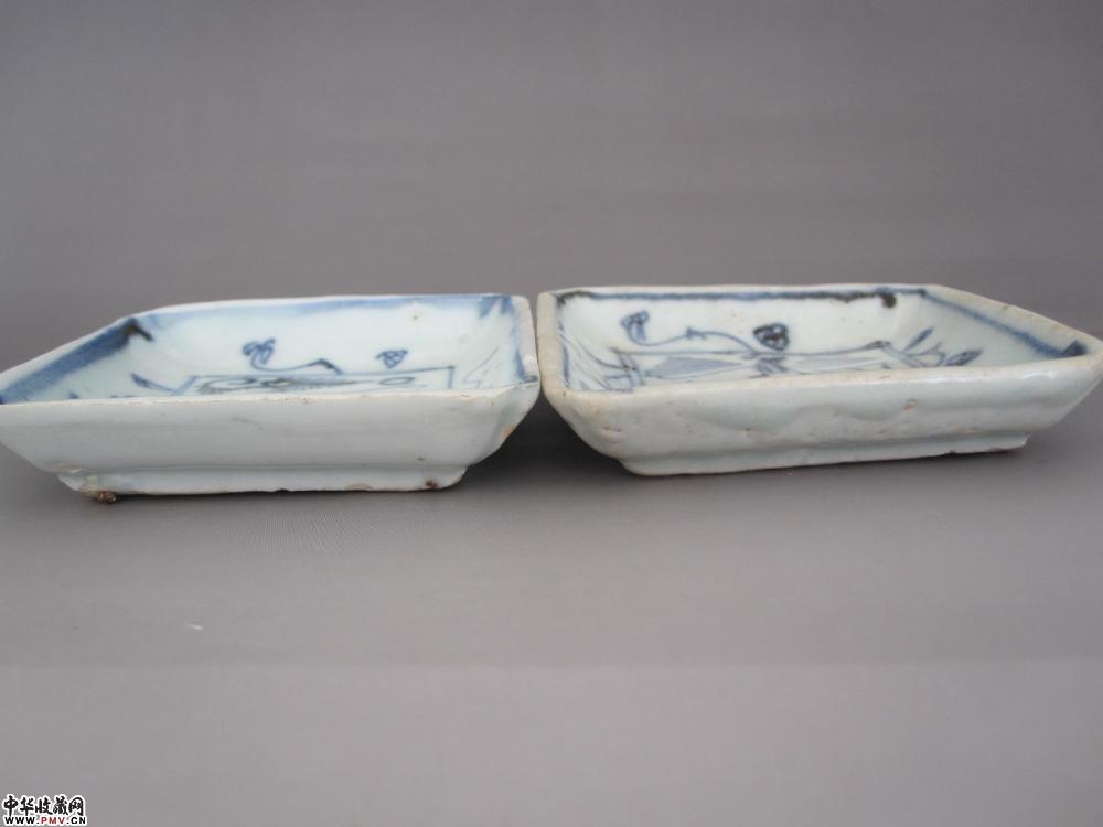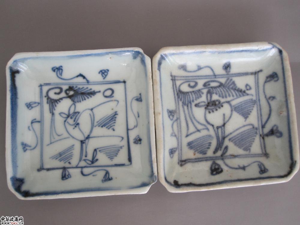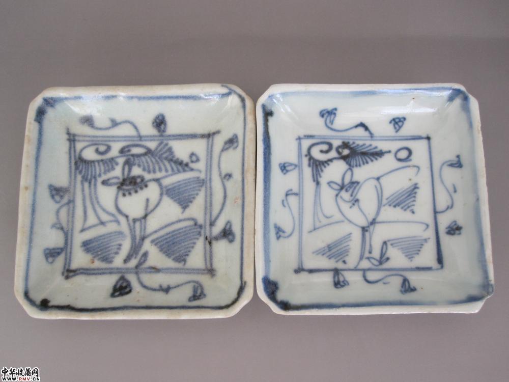 明万历景德镇窑青花铁线描水草动物纹方碟《一对》《已售》
