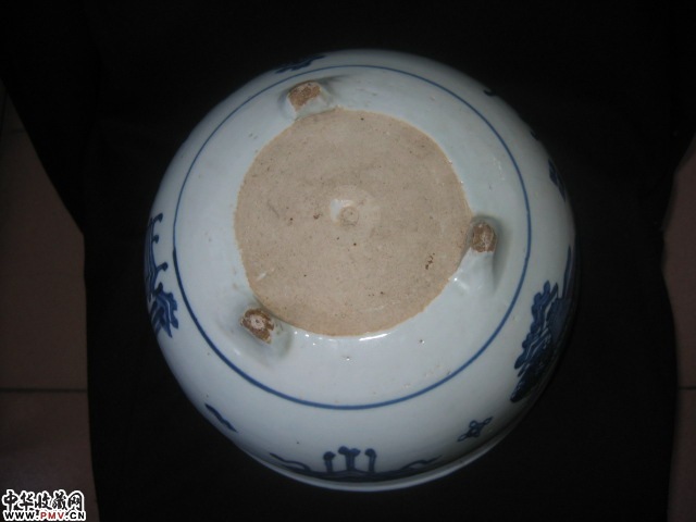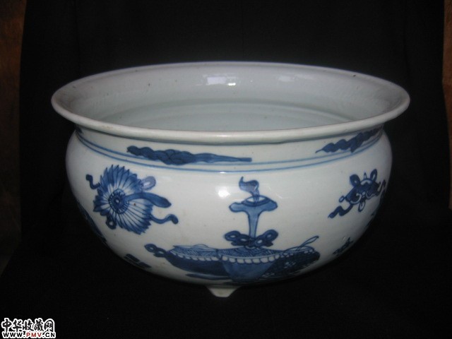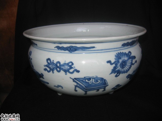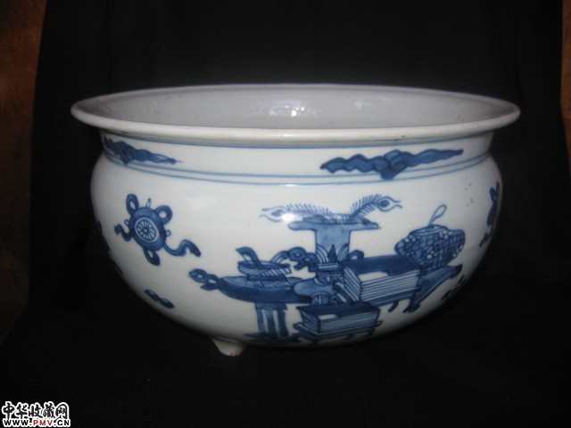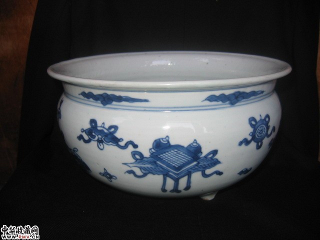 ●外腹画博古纹5组,5组博古纹之间填画八宝。青花发色一流。器型呈钵式,故可称为钵式炉。器型硕大,很有气势。加以全品,没有任何损伤,因此可以说是一件难得的藏品。