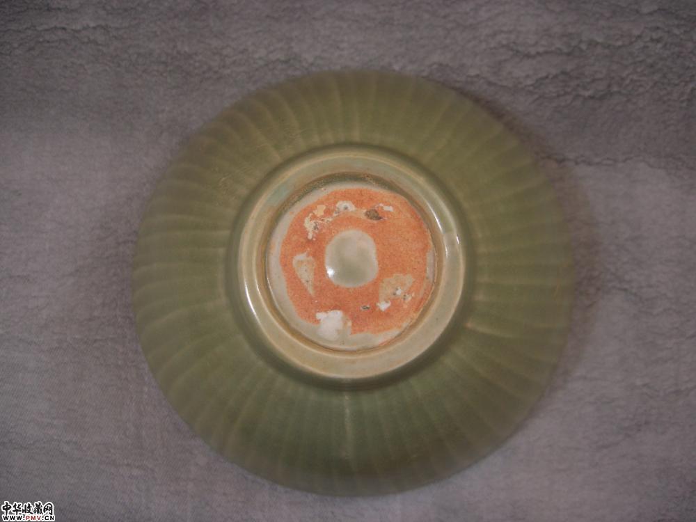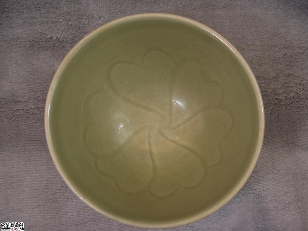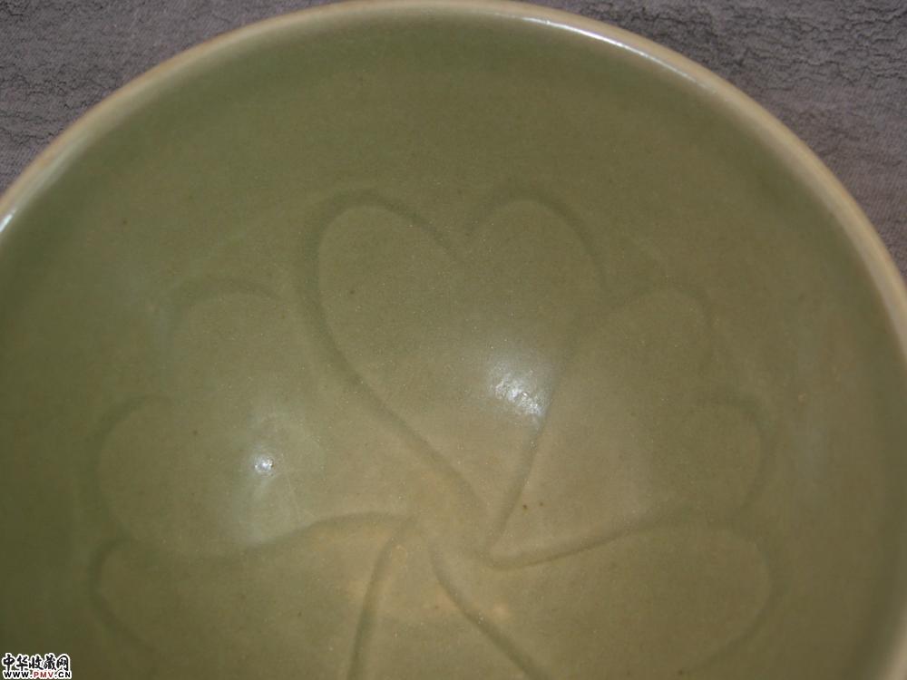 碗外为细密的菊瓣纹,碗内为交织的菊瓣纹.内外皆施青釉,釉色纯正,气泡大小叠积,足底部分露胎.器型规正,纹饰优美