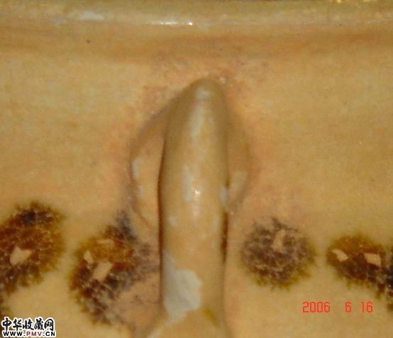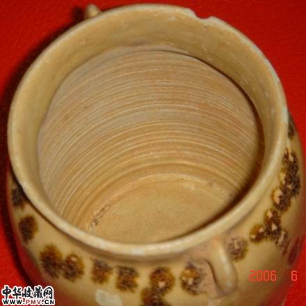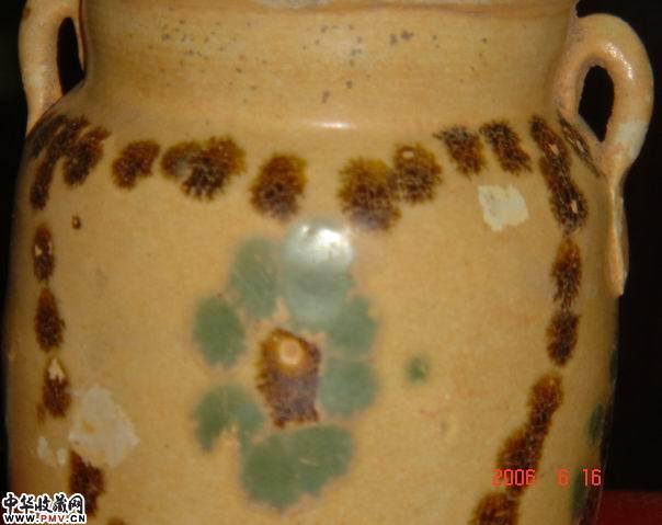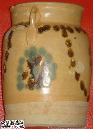唐长沙窑青色釉下褐蓝彩连珠纹双系罐