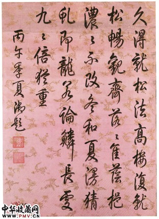 水墨描金龙云绢 对联 1760年作 释文:性源溯周孔,治道在虞唐。 乾隆庚宸(1760年)秋月御笔。 钤印:乾隆宸翰、烟云舒卷