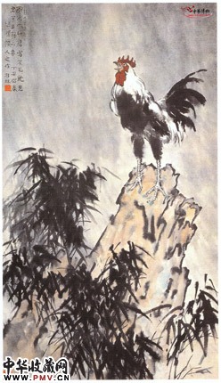画左上题:“风雨如晦,鸡鸣不已,既见君子,云胡不喜。丁丑始春,悲鸿怀人之作。桂林。”题诗取自《诗经》风雨篇而另有寓意。1937年(丁丑年)日本帝国主义加紧对中国的侵略,画家借“风雨鸡鸣”的诗意来抒发自己的爱国之情。画中立于峻峭巨石上的一只冠红似火的大白雄鸡,挺胸昂首望天长鸣;石旁象征民族气节的墨竹丛生;背景为“风雨如晦”的漫漫长空。