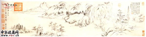 此图真谓奇峰图,一突兀的山峰直立图中,其势高耸入云。悬崖峭壁,不见山路,惟有层层白云拥于山腰间。白云下面连绵山峰,丘壑丛林。近群树成行,劲枝繁叶,树丛中隐现草舍。山峰用淡笔勾勒出轮廓,作横笔米点皴,留出在大片参差空白,以示白云。山石用润笔,连皴带擦,画面突出山峰,渲染江南秀润风光,体现了董其昌秀朗明润的笔墨水技巧和葱郁苍茫的山水画风格。