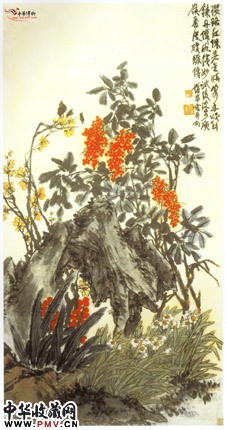 此图绘制工整,含蓄,不同于常见的豪放不羁,水墨淋漓的风格,绘一块怪石,拖笔烘染,坚实稳重,天竺、水仙、腊梅、万年青环绕四周,花叶纷纷,枝杆纵横,各尽其趣。整幅构图严密,繁而不乱,疏而不漏。设色鲜丽,令人醒目,沉着端庄,艳而不俗,诗画交融,情意俱佳。
